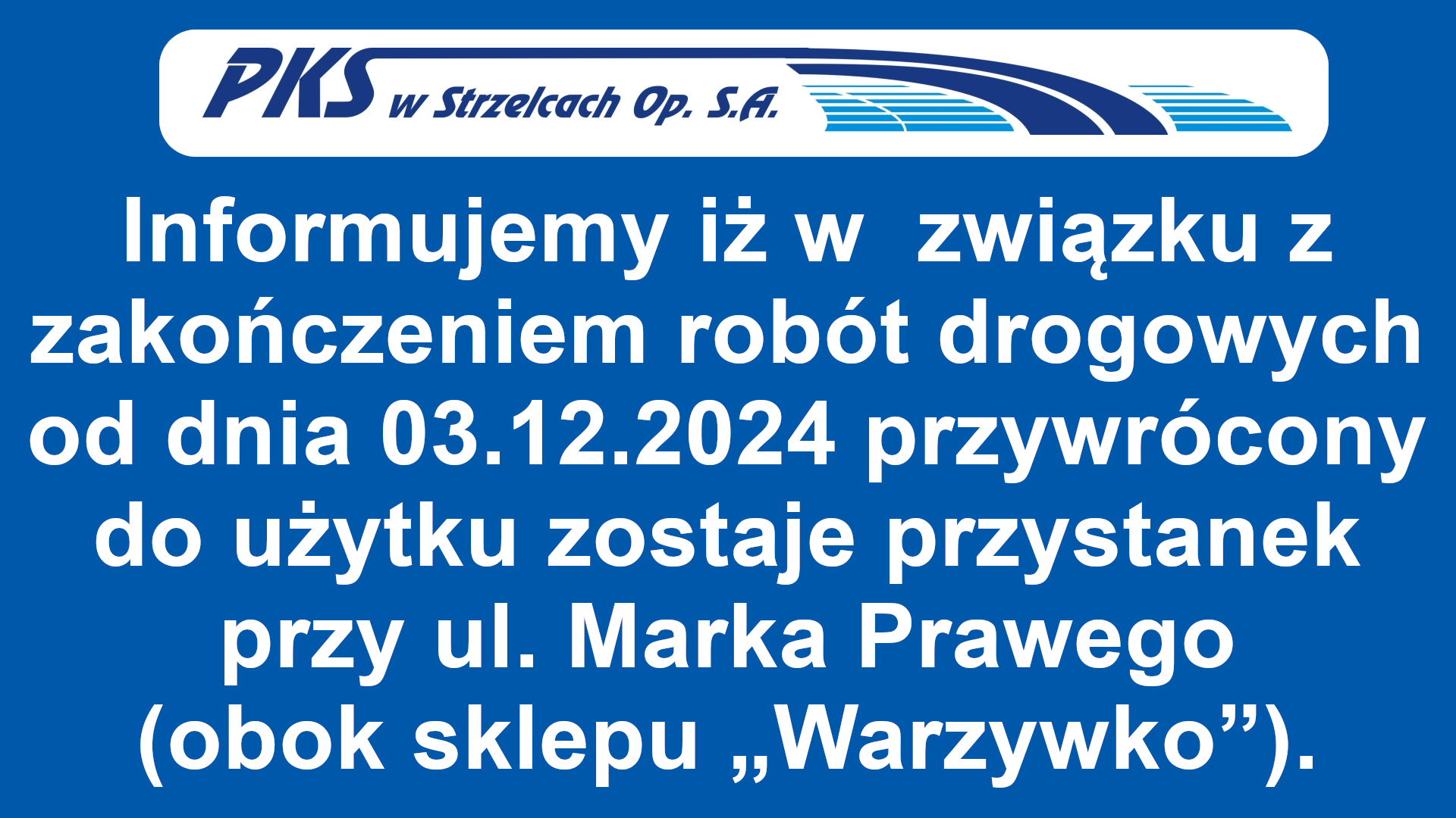 Uruchomienie przystanku Kolonowskie Dworzec Kolejowy Linia nr 7 - nowy przystanek na Rynku w Strzelcach Opolskich Zakończenie remontu drogi w Suchodańcu Kasy biletowe - ważna informacja Życzenia świąteczne - Wielkanoc 2025 Ważna informacja dla seniorów z gminy Krapkowice